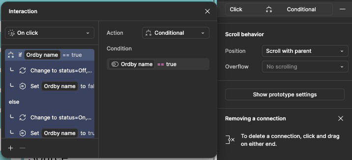 Now comes the tricky part. I had to figure out how to have each of those booleans react to the toggle switches that I set up and have the switch indicate the correct status. For this, I used the conditional action available in the prototyping settings.